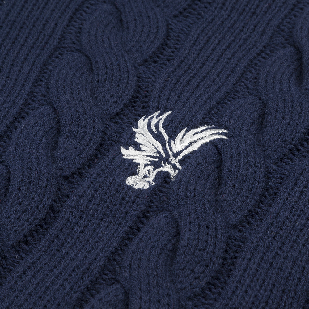 The textured cable knit pattern adds depth and heritage style, while the sleek navy colourway keeps the look refined and versatile. Whether worn on matchdays at Selhurst Park, in the office or out in the city, this jumper offers effortless style with subtle club character.